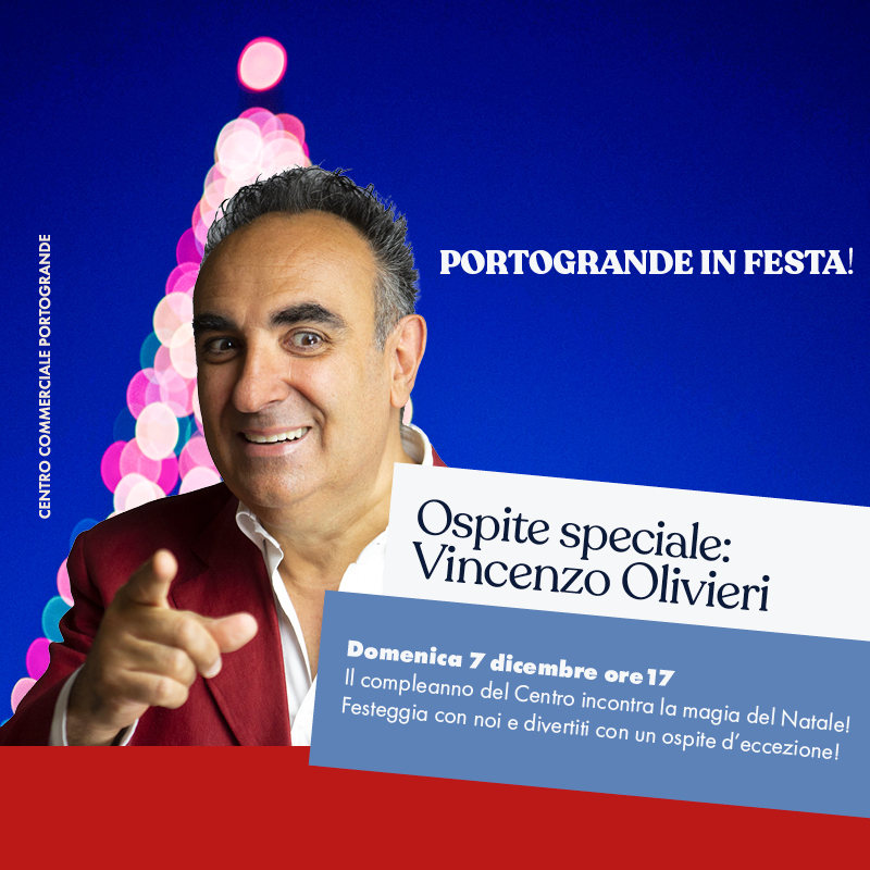 A PortoGrande c’è aria di festa! In occasione del compleanno del Centro e dell’arrivo del periodo più magico dell’anno, abbiamo organizzato un appuntamento davvero speciale. Vieni a trovarci domenica 7 dicembre, dalle ore 17.00, e vivi un pomeriggio pieno di divertimento con il nostro super ospite Vincenzo Olivieri. Non mancare!